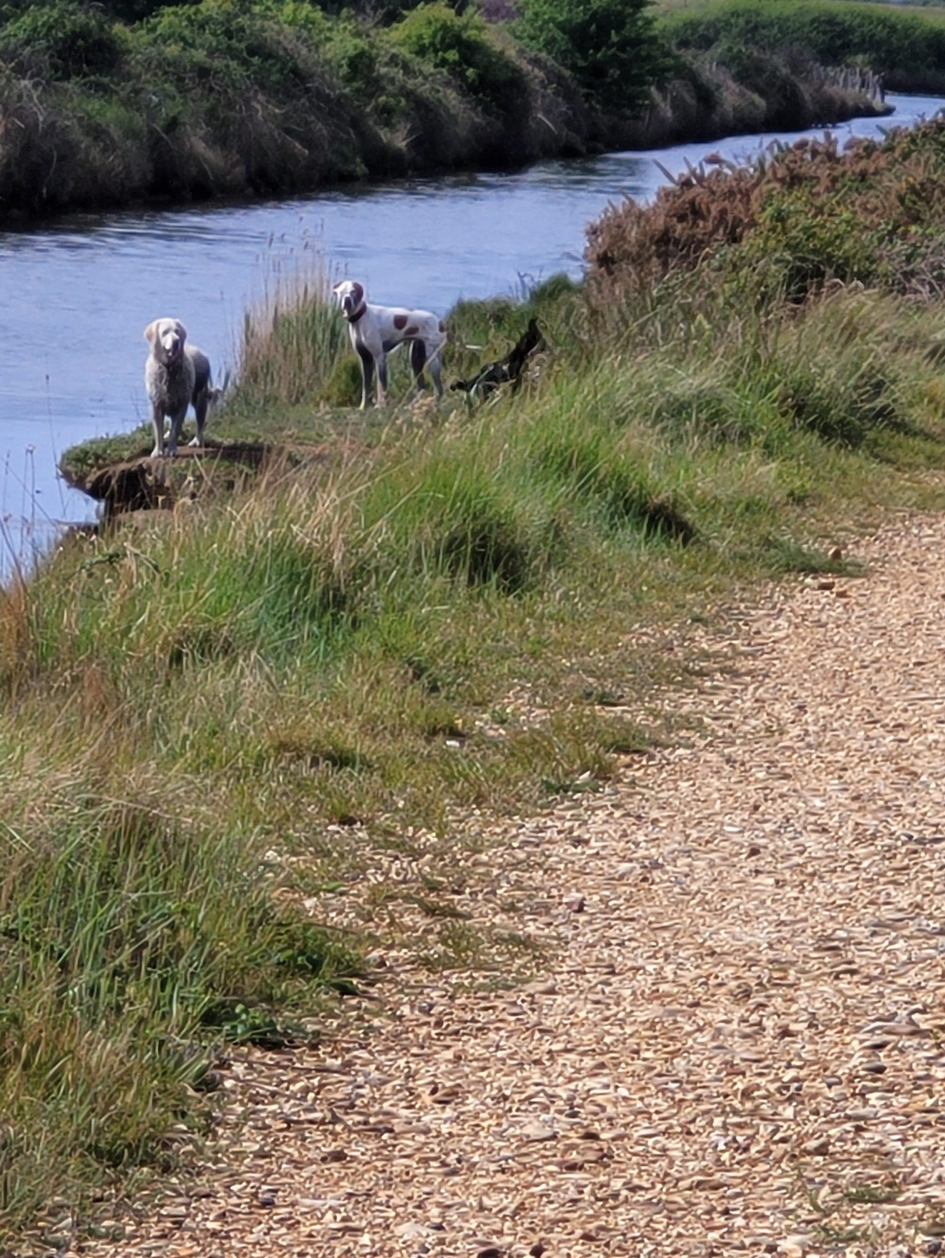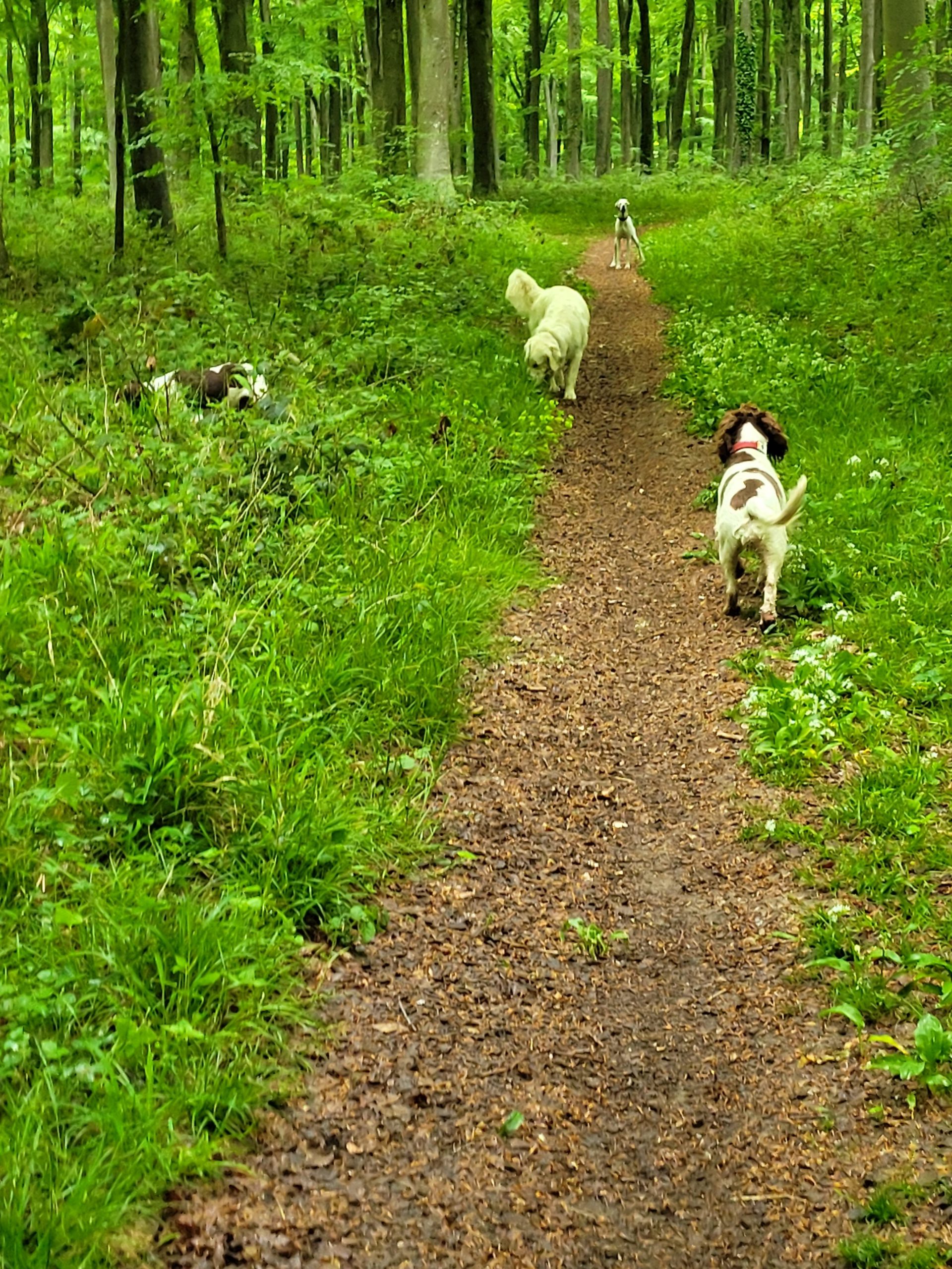 Our daily routine is to go for a long morning walk somewhere. Favourite destinations are Stoughton, Stansted, Kingley Vale, Centurion Way, Woodend, Prinsted, after which we return home and relax. In the afternoon we go out to the paddock or garden for a run around where there is usually a ball or two in play. Then its home time or dinner, and then bed. This daily routine seems to spend their energy and they end the day happy and tired.