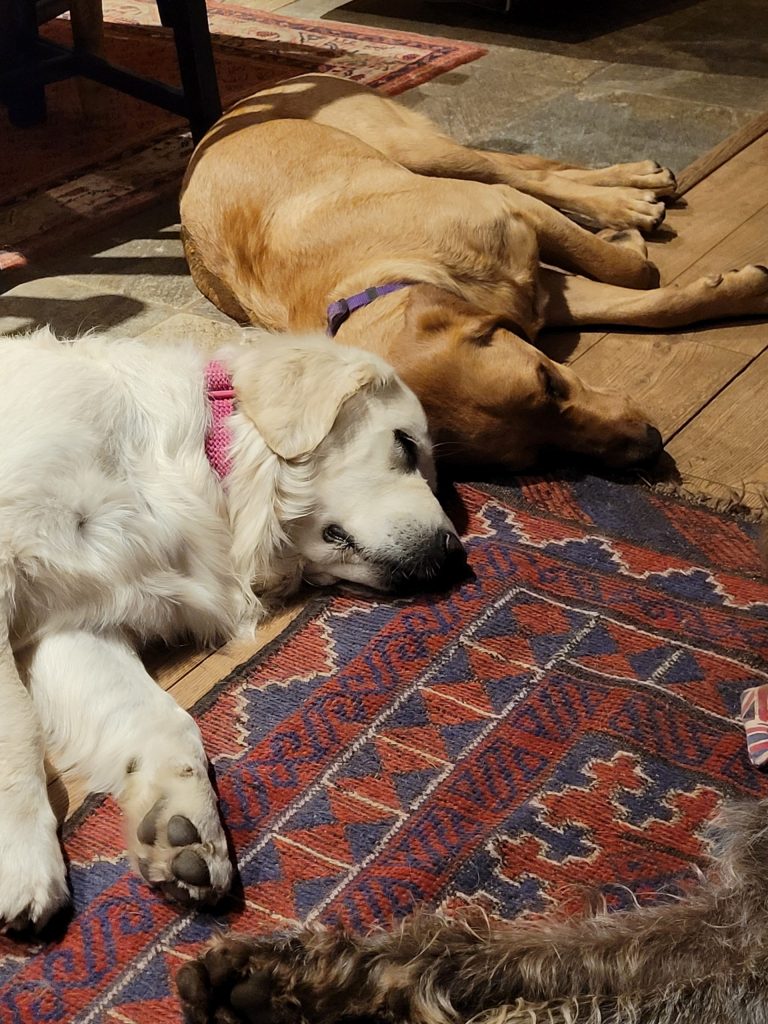Our home is spacious with a large garden and paddock where they can play and socialise. Guest dogs are always with us as part of the family, watching TV or lying by my feet while I cook (just in case they hear the odd ‘oops’ and a morsel drops). Amazing how they are always on alert while they pretend to sleep.